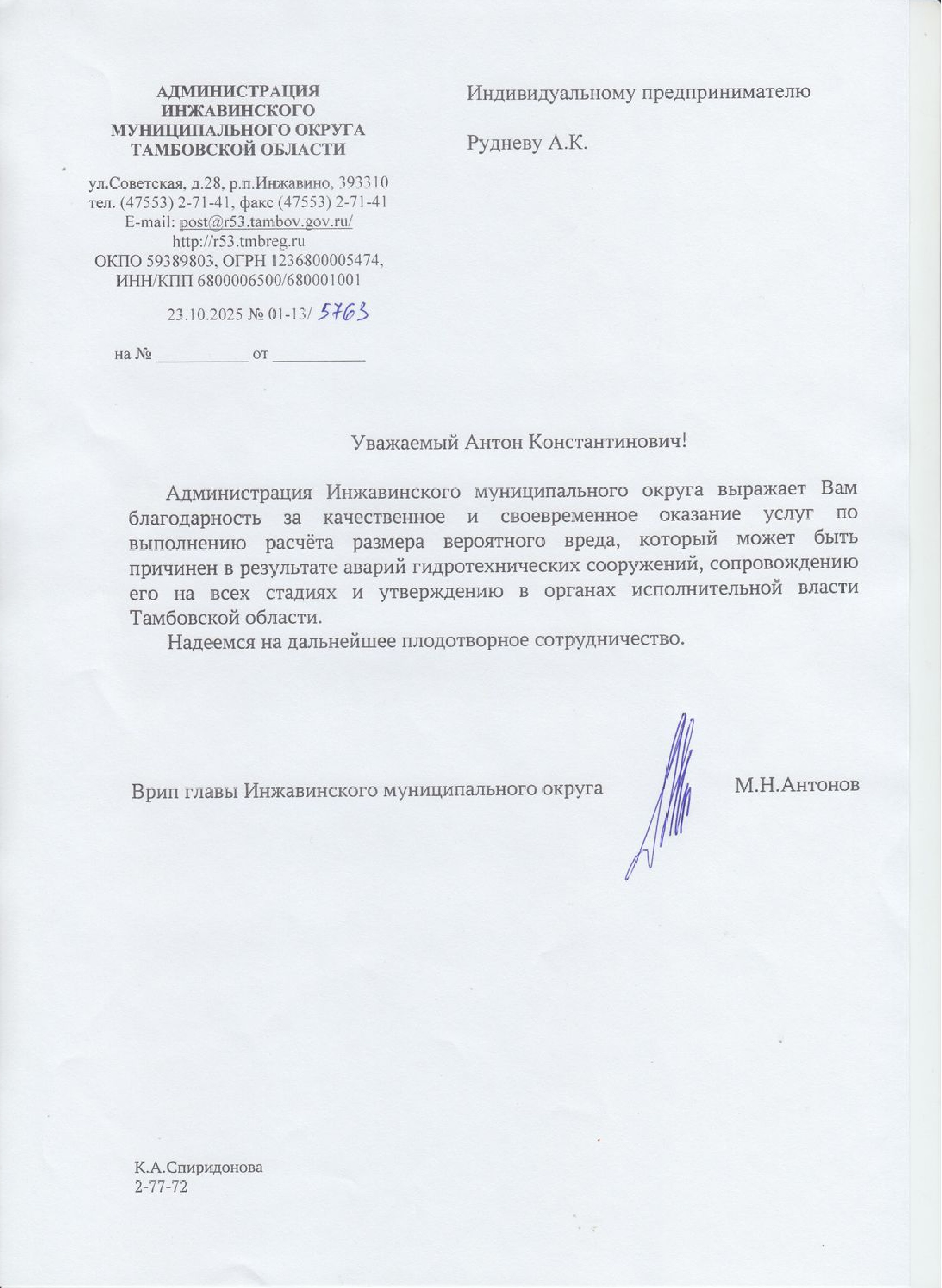 Администрация Инжавинского муниципального округа Тамбовской области выражает благодарность за качественное и свовременное оказание услуг по выполнению расчета размера вероятного вреда, который может быть причинен в результате аварий ГТС, сопровождению его на всех стадиях и утверждению в органах исполнительной власти Тамбовской области. Надеемся на дальнейшее плодотворное сотрудничество.