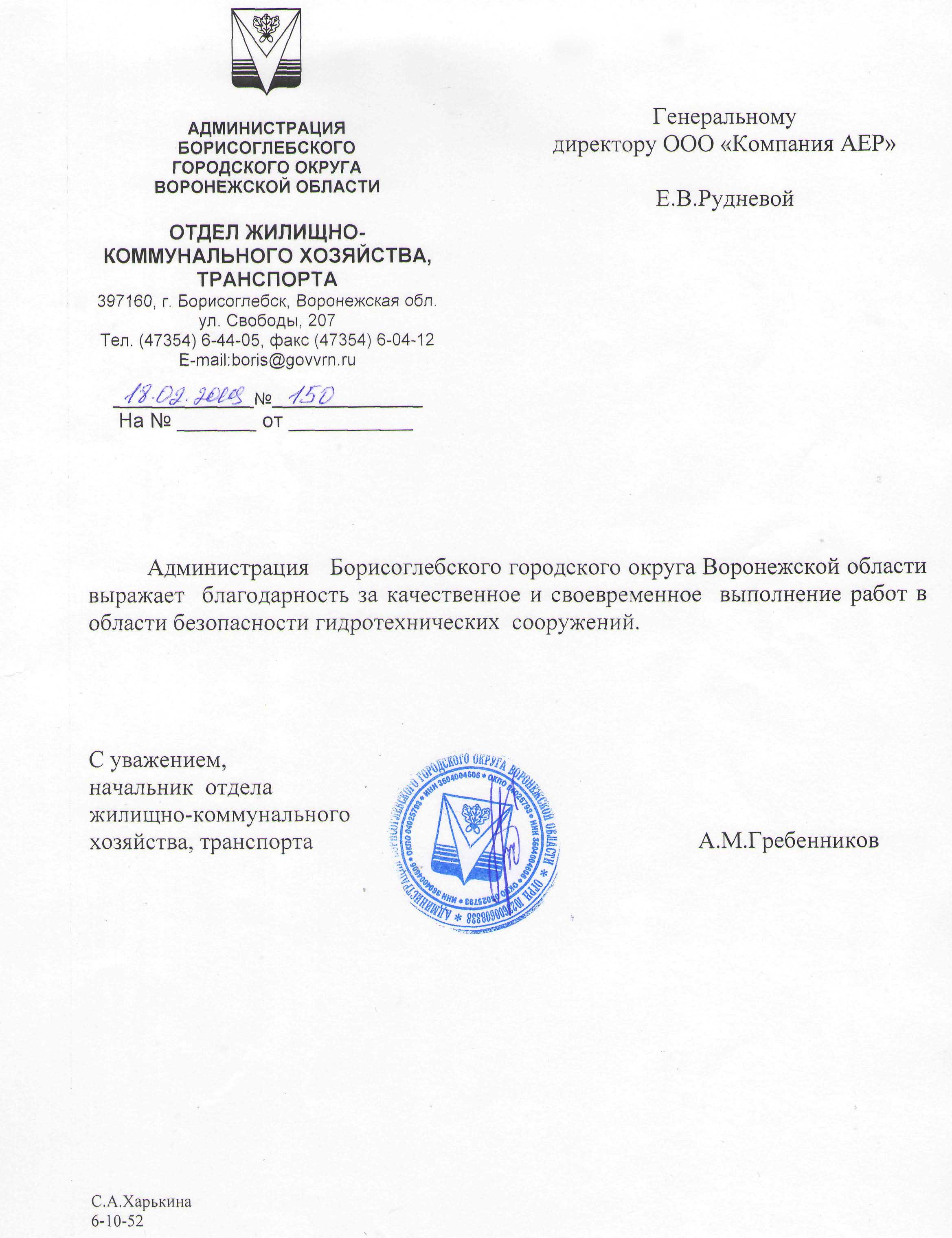 Администрация Борисоглебского городского округа Воронежской области выражает благодарность за качественное и своевременное выполнение работ в области безопасности гидротехнических сооружений.