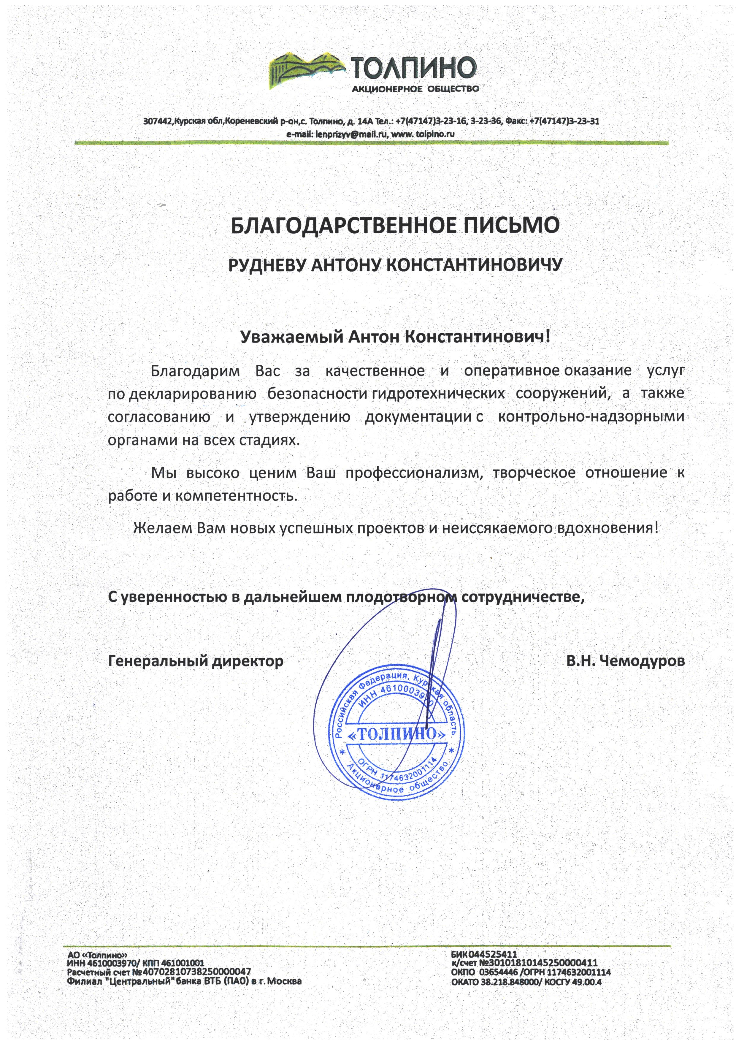 «АО «Толпино» выражает благодарность Рудневу А. К. за качественное и оперативное оказание услуг по декларированию безопасности гидротехнических сооружений, согласованию и утверждению документации с контрольно-надзорными органами на всех стадиях».