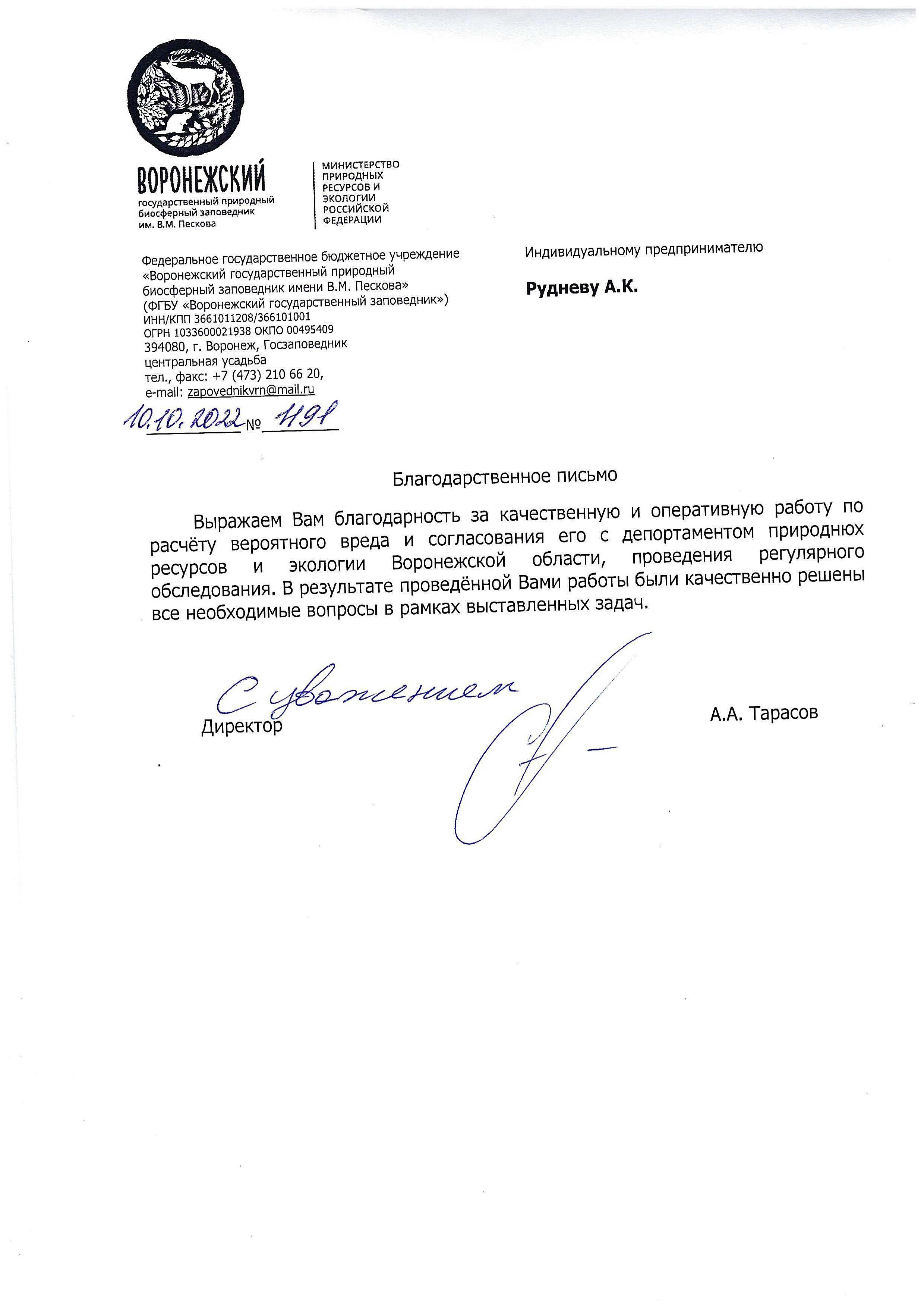 Выражаем Вам благодарность за качественную и оперативную работу по расчету вероятного вреда и согласования его с Департаментом природных ресурсов и экологии Воронежской области, и проведению регулярного обследования ГТС. В результате проведенной Вами работы были качественно решены все необходимые вопросы в рамках поставленных задач.