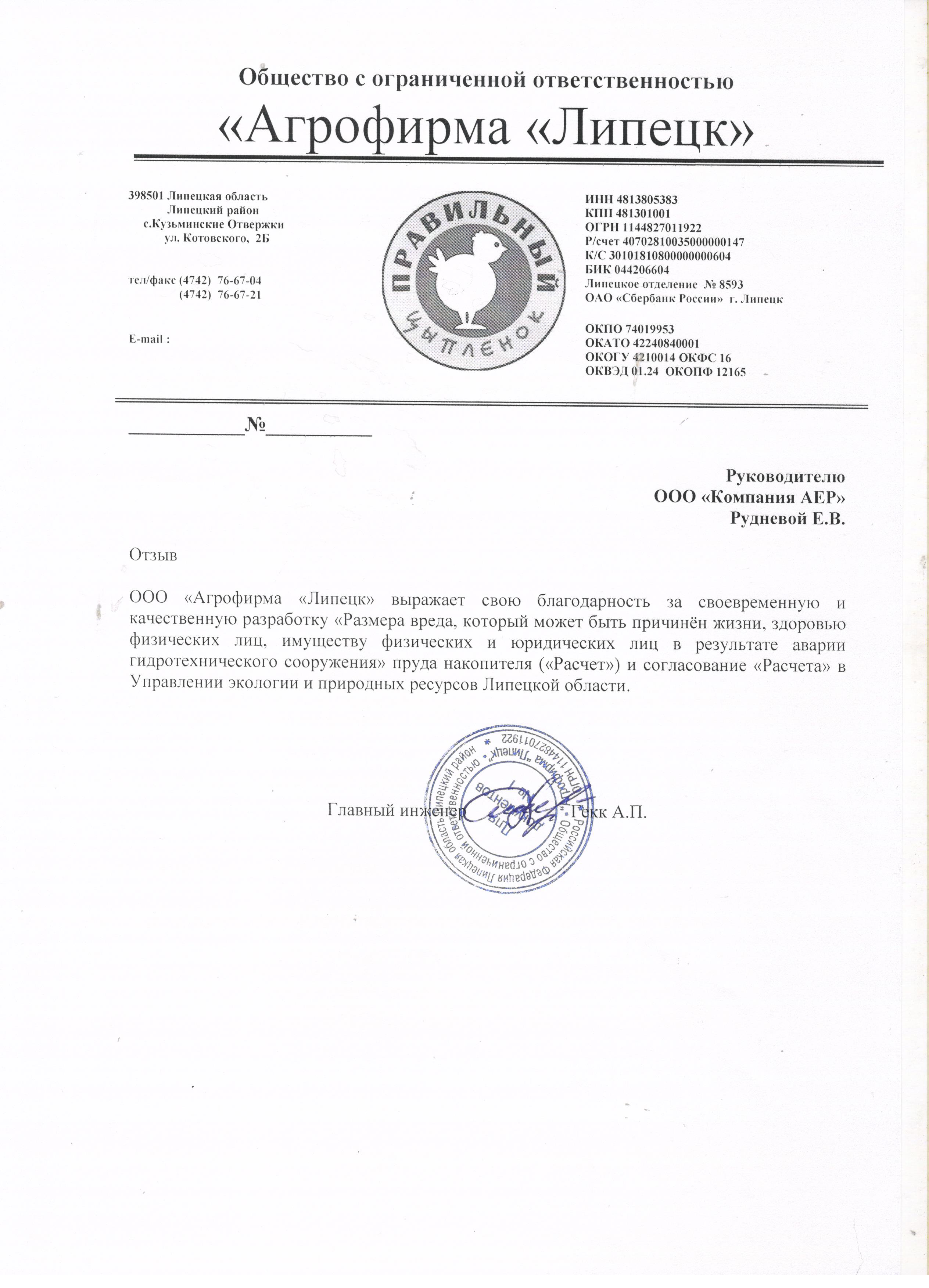 ООО «Агрофирма «Липецк» выражает свою благодарность за своевременную и качественную разработку «Размера вреда, который может быть причинён жизни, здоровью физических лиц, имуществу физических и юридических лиц в результате аварии гидротехнического сооружения» пруда накопителя и согласование его в Управлении экологии и природных ресурсов Липецкой области.