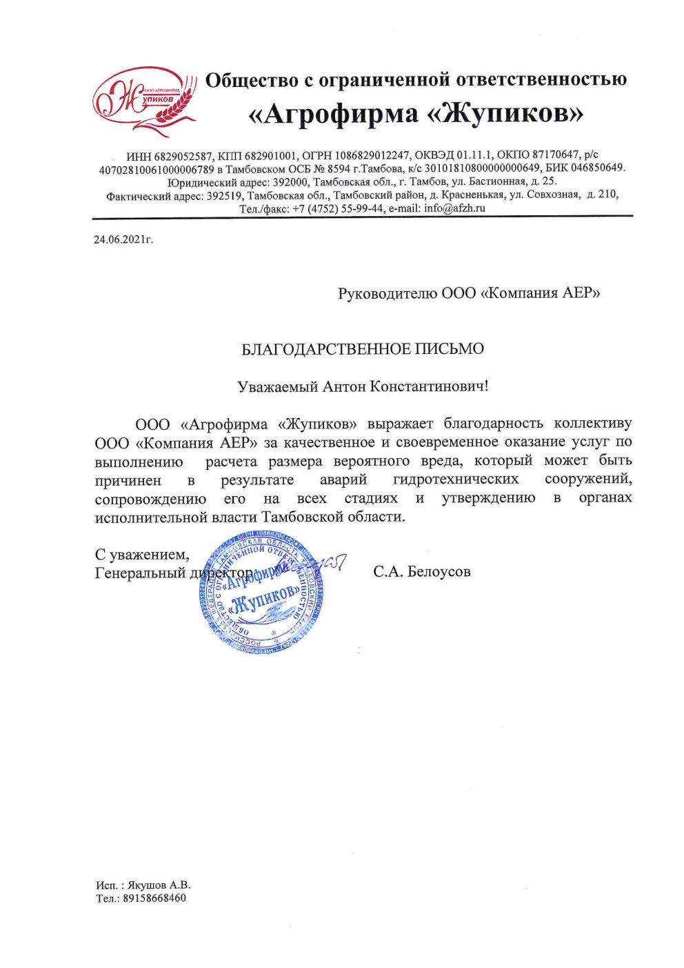 ООО "Агрофирма "Жупиков" выражает благодарность коллективу ООО "Компания АЕР" за качественное и своевременное оказание услуг по выполнению расмчета вероятного вреда в результате аварий гидротехнических сооружений, сопровождению его на всех стадиях и утверждению в органах исполнительной власти Тамбовской области.
