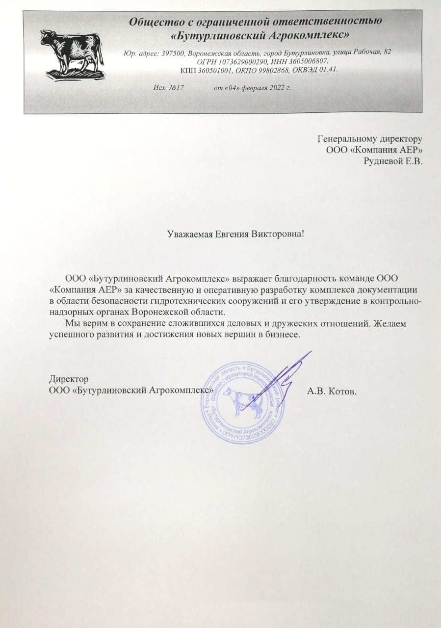 ООО "Бутурлиновский Агрокомплекс" выражает благодарность команде ООО "Компания АЕР" за качественную и оперативную разработку комплекса документации в области безопасности гидротехнических сооружений и его утверждение в контрольно-надзорных органах Воронежской области.