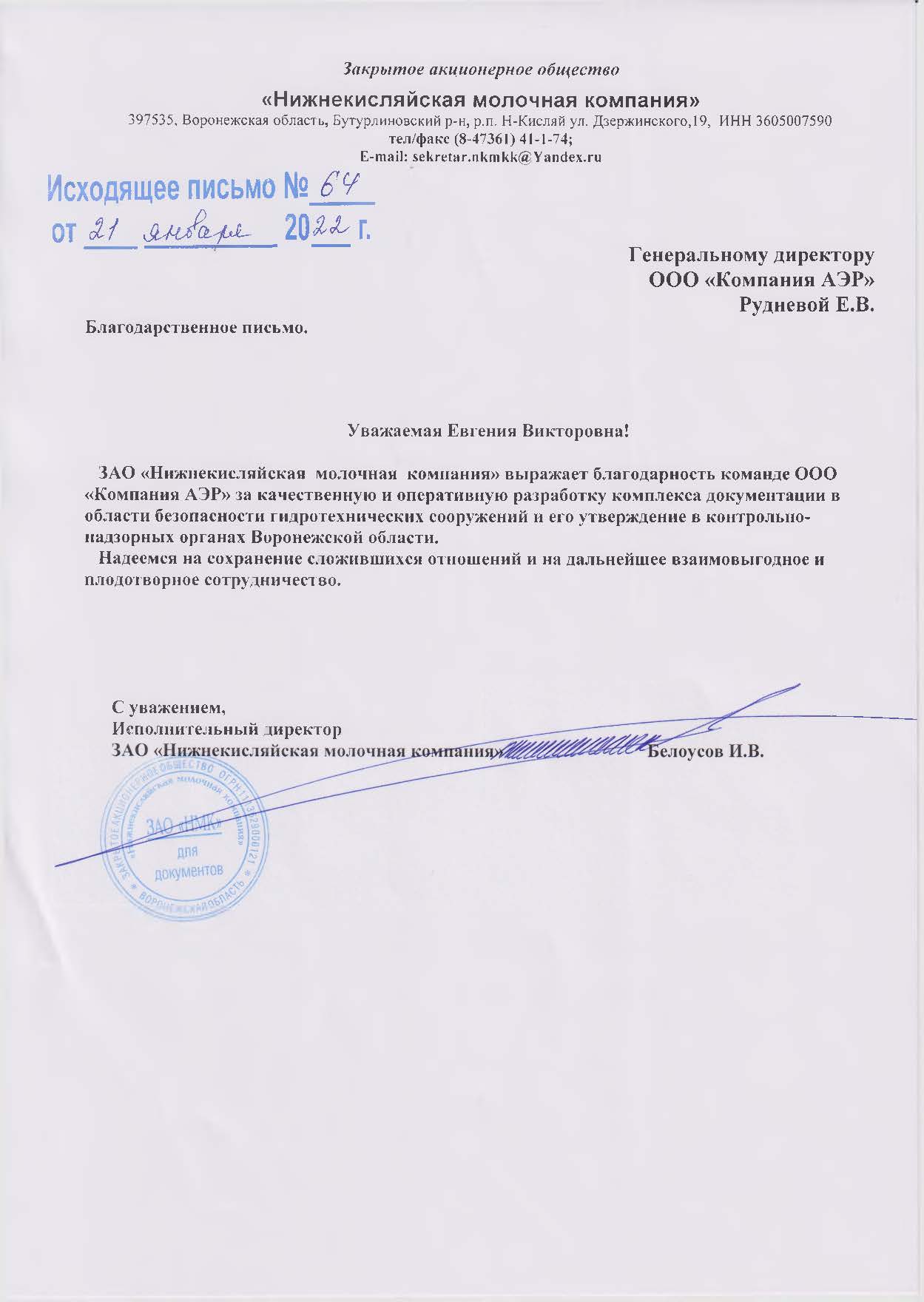 ЗАО "Нижнекисляйская молочная компания" выражает благодарность команде ООО "Компания АЕР" за качественную и оперативную разработку комплекса документации в области безопасности гидротехнических сооружений и его утверждение в контрольно-надзорных органах Воронежской области.